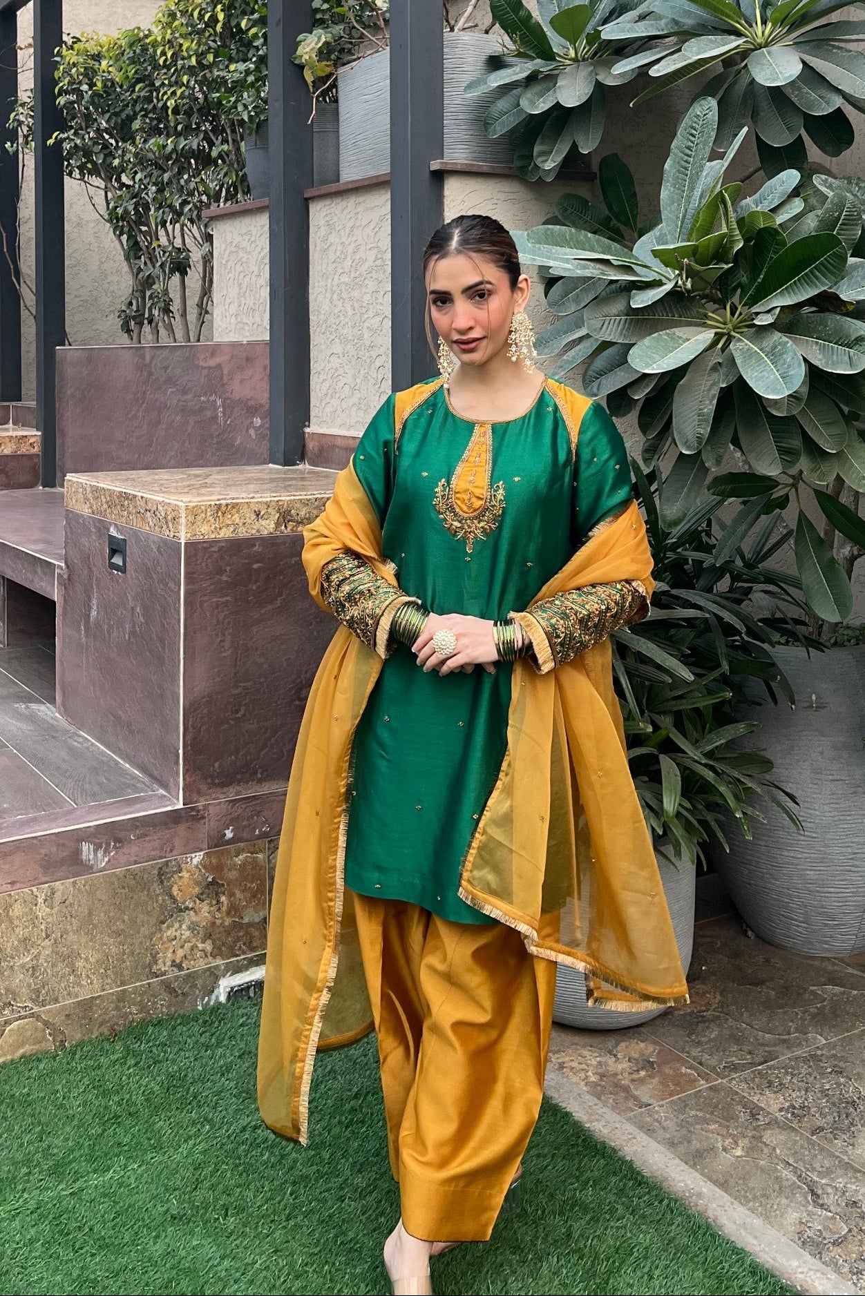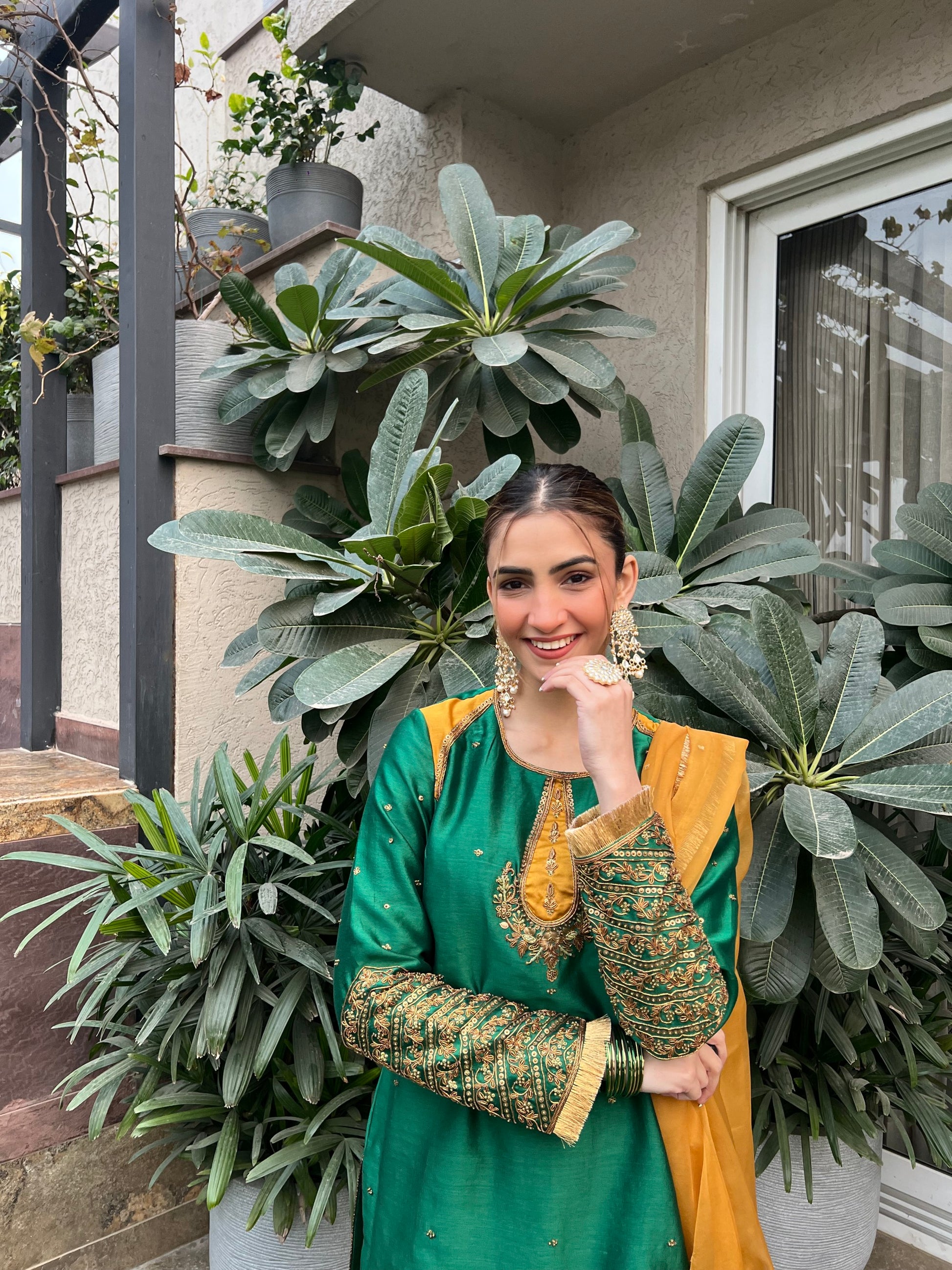 A timeless straight short kurta, delicately adorned with hand-done zardozi embroidery. Crafted in lustrous Chanderi silk, the silhouette feels light yet refined. The round neckline is elevated with contrasting appliqué, adding quiet depth and character. Straight long sleeves are finished with intricate embroidery, echoing the beauty of fine craftsmanship. Paired with a graceful farshi salwar detailed with subtle dori piping at the hem, and completed with an airy organza dupatta featuring delicate cheeta embroidery — this ensemble is an ode to elegance, tradition, and thoughtful handwork.