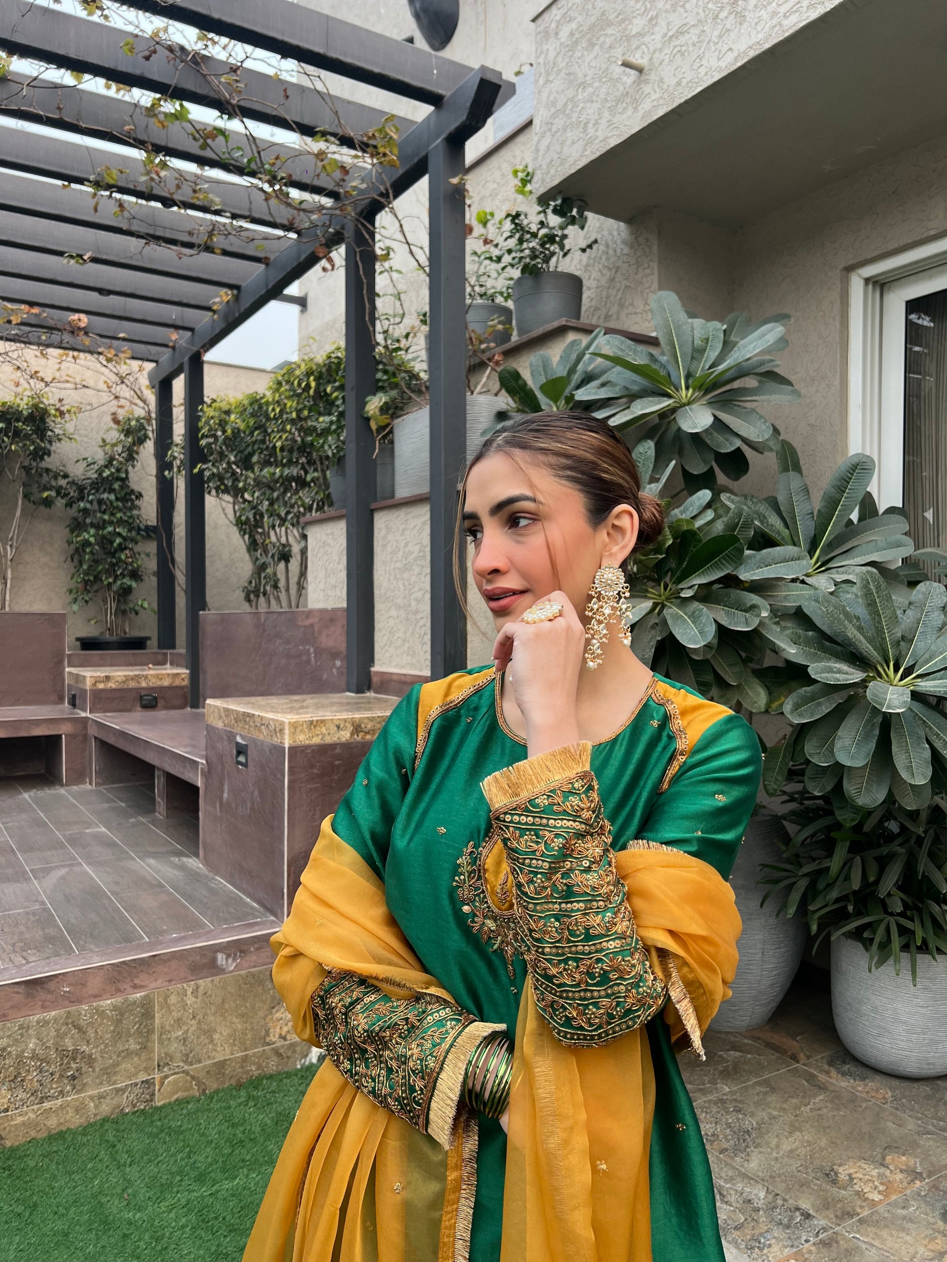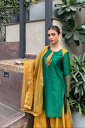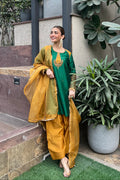 Mehreen Chanderi Silk Straight Kurta with Zardozi embroidery, Farshi Salwar and embroidered organza dupatta