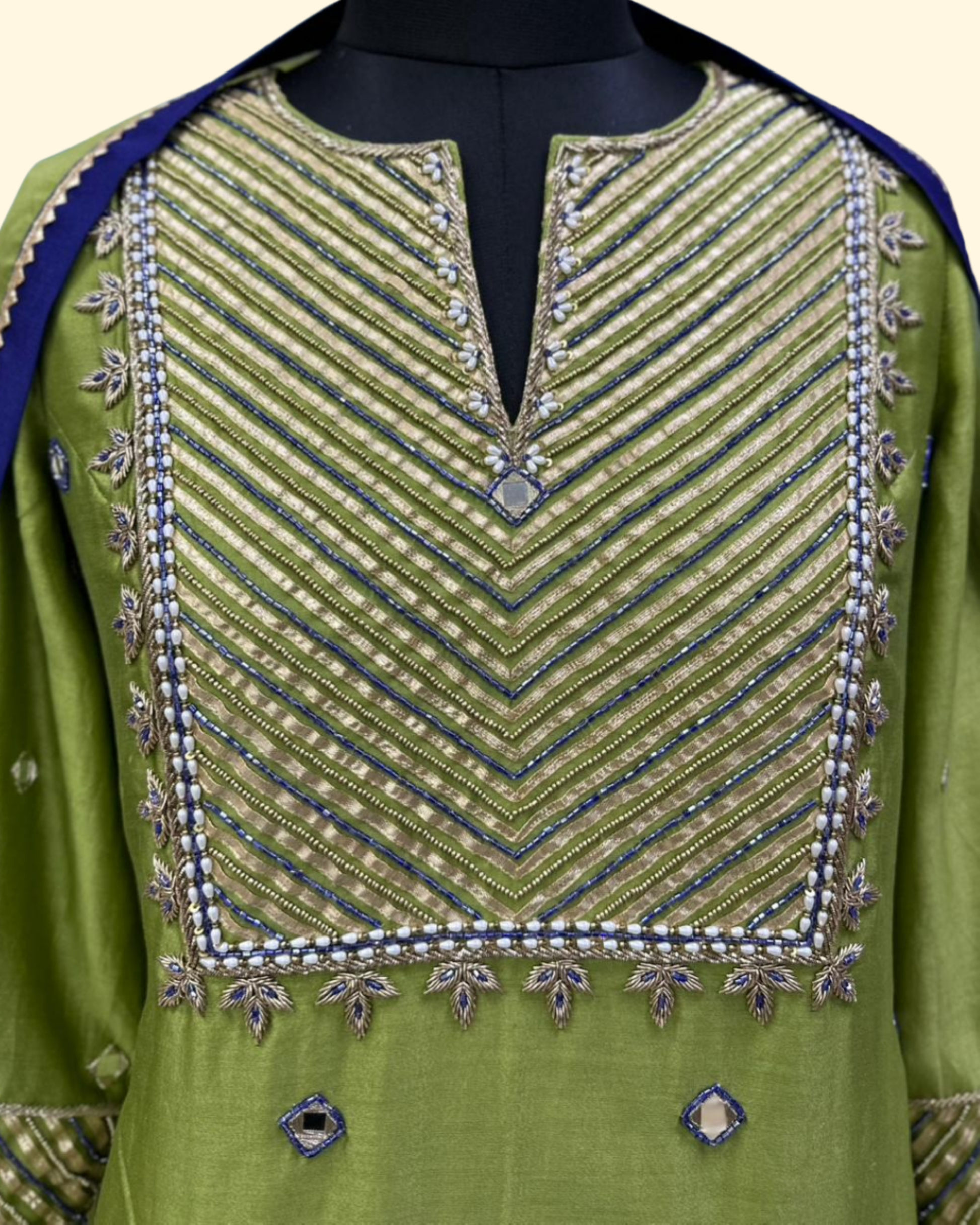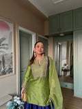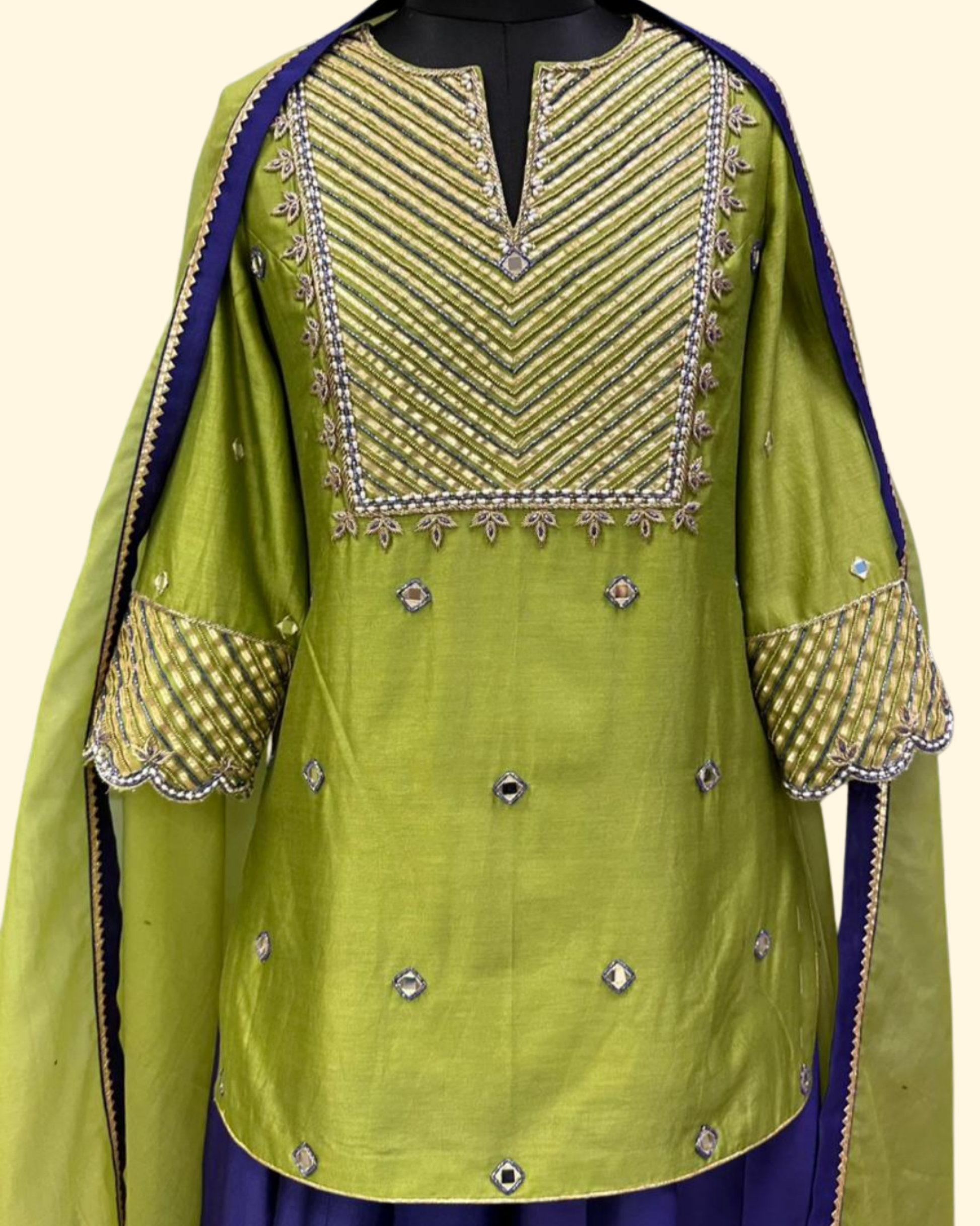 A striking blend of vibrance and elegance, this Chanderi silk short kurta in a refreshing parrot green hue is adorned with intricate gota and zardozi embroidery, adding a festive shimmer to your look. The kurta features regular sleeves with scalloped edges for a graceful finish.