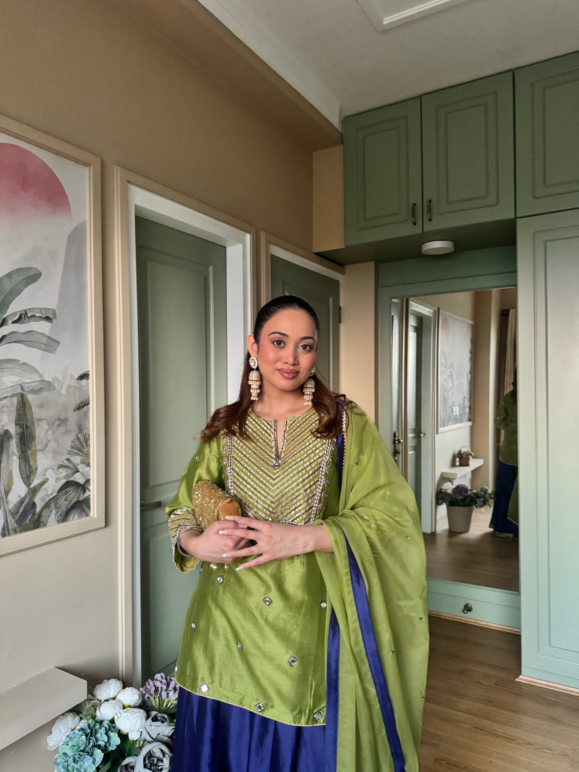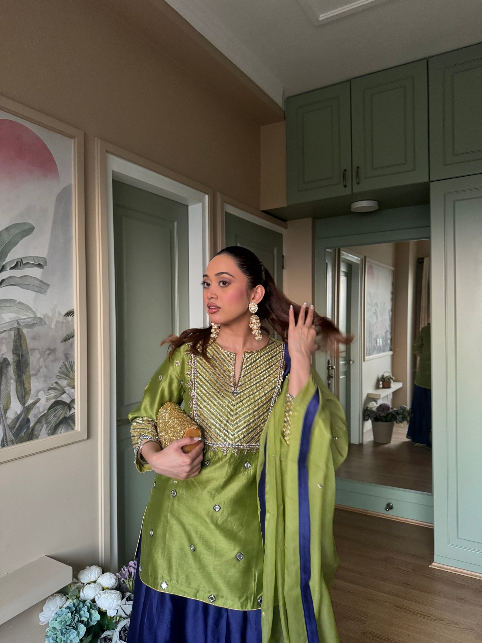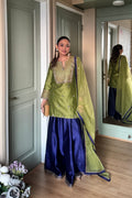 Paired with a contrasting blue silk sharara, detailed with gota highlights and a convenient side pocket, the ensemble beautifully balances tradition with functionality. The look is completed with an organza dupatta, embellished with contrast patti and delicate booti embroidery, adding a sheer, ethereal charm.